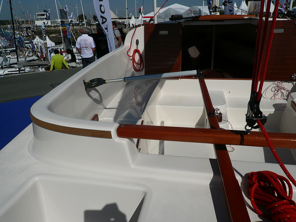 Gréement houari, coque et pont en composite de fibre de verre-polyester ; Bancs extérieurs, 2 panneaux de fermeture cabine, fargues de coffre de cokpit, entourage de baille à mouillage et gouvernail en contreplaqué marine. Barre et listons et mains courantes en bois exotique massif. Dérive, mat, bôme et pic. Voiles de couleur beige ou « tan ».
